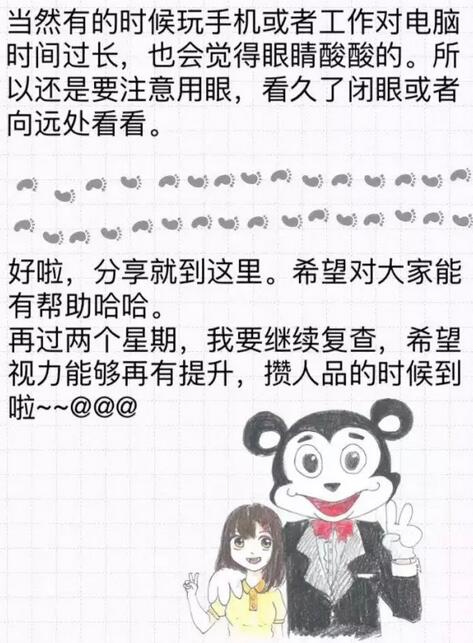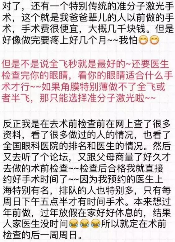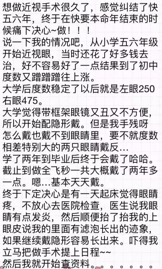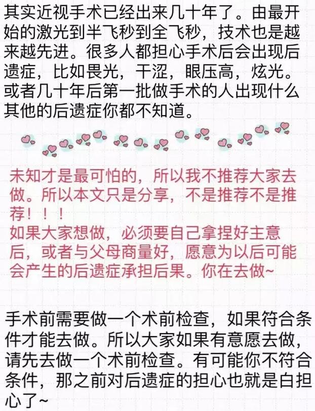你好!我是2016年12月18日在和平眼科做过全飞秒的患者~现在已经摘掉眼镜了,特别开心!附件有一个我写的分享,一共是7页图片,希望能给其他还没做或者犹豫做手术的朋友们带来帮助。写了好几晚,终于写完了~