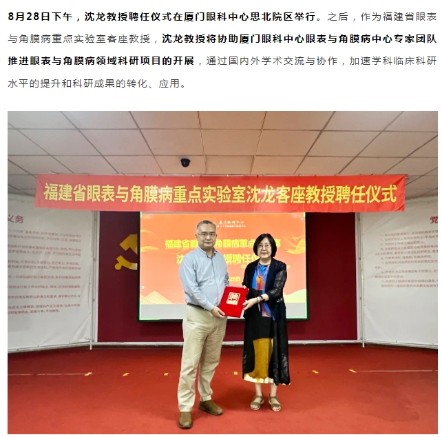 再添专家!厦门眼科中心聘请沈龙教授为福建省眼表与角膜病重点实验室客座教授