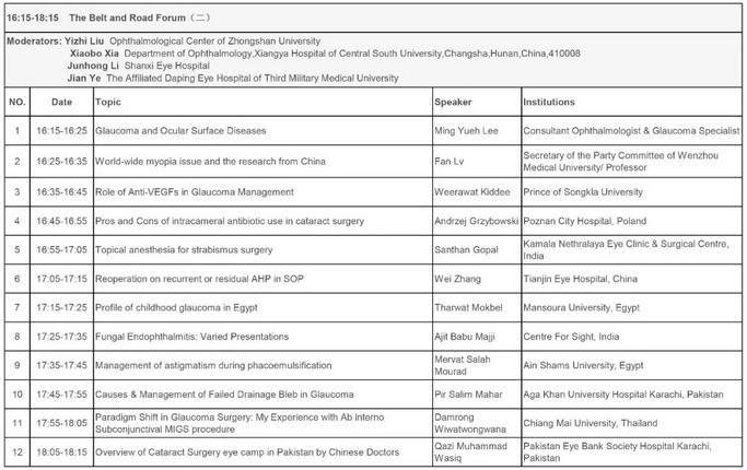 首届“一带一路眼科论坛”邀请到了来自美国、俄罗斯、日本、波兰、印度、韩国、新加坡、马来西亚、泰国、埃及、巴基斯坦等十几个国家和地区的19位眼科学会主席和专家出席会议,对当今热门的人工智能、儿童白内障手术、飞秒激光白内障手术、青光眼微创手术、复杂性青光眼处理及眼底病等进行专题报告。中华医学会眼科学分会主委姚克教授也将携四位国内眼科专家在白内障、眼底病、斜视、视光学等 新进展带来精彩的报告。