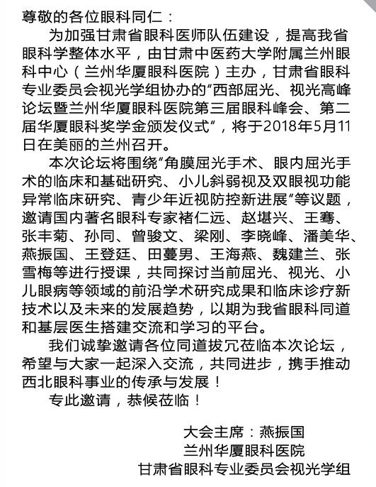 西部视光、屈光高峰论坛暨兰州易游体育第三届眼科峰会第二届“易游体育奖学金”颁发仪式邀您莅临!